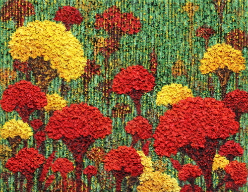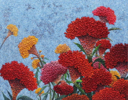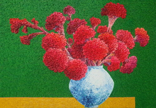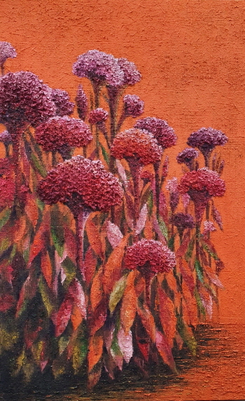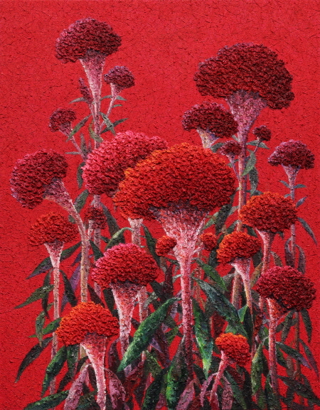 맨드라미는 우리 조상들이 아주 사랑한 꽃이다. 이 꽃은 자식의 입신양면을 바라고 성공을 바라는 부모의 간절한 소망도 담아 내며 뜨겁게 여름을 불사르는 꽃이다. 그 열망의 끝은 찬 서리 내리는 겨울까지 고고함을 잃지 않고 생성과 소멸의 최고봉인 듯하여 나도 그 앞에 서면 가슴이 뛴다. 붓을 가지고 세상의 이야기를 수놓다가, 어느날 문뜩 두 눈이 뜨겁도록 마주한 붉은 맨드라미가 나에게 온지 어언 15년도 넘어서고 있다. 그리고 세월과 함께 동화되어 꽃이 내가 되고, 내가 꽃이 되었다. 이제는 눈을 감고도 그 세계를 거닌다.
