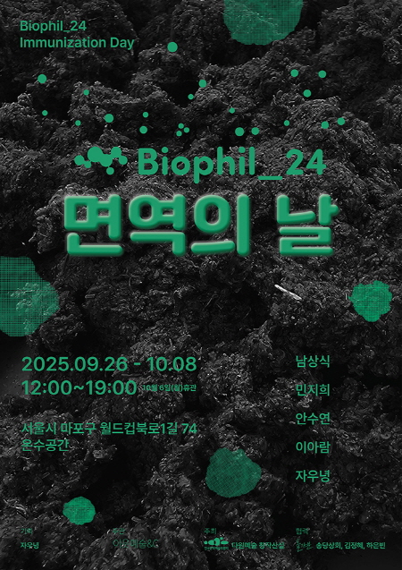 바이오필리아(Biophilia)란 심신의 회복을 위해 산과 바다와 같은 자연을 찾는 현상이며, 이 현상은 주로 도시민들에게서 찾아볼 수 있습니다. 본 전시는 이와 같이 휴식을 취하기 위해 자연으로 여행을 떠나는 사람들을 바이러스(Biophil-24)에 ‘감염’되었다고 바라보고 이에 대한 사람들의 움직임을 생존 방식으로 인식합니다. 이와 같은 현상을 생명에 대한 위기의식의 증후(症候)로도 비춥니다.