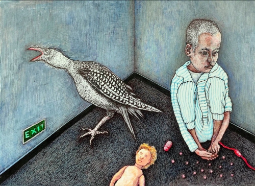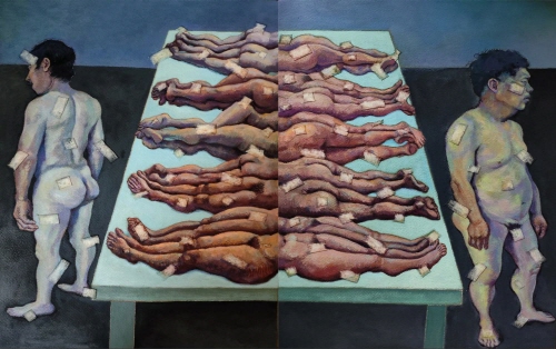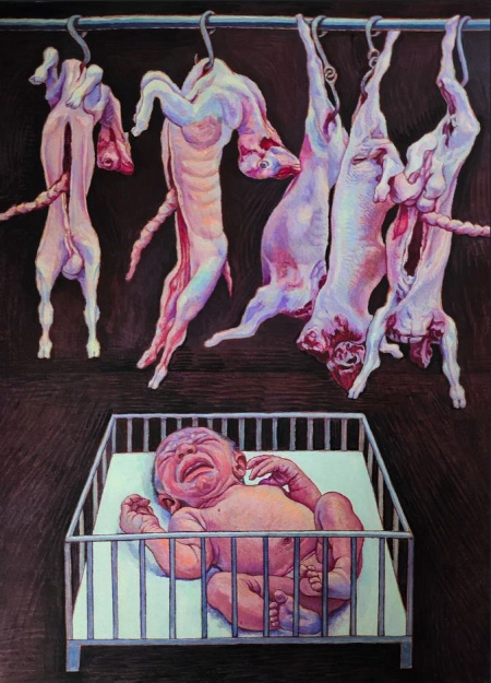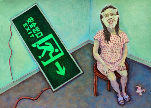 나는 이러한 경험을 회화를 통해 시각화하고자 하였다. 작품 속 인물들은 종종 폐쇄적이고 압축되거나 격리된 공간에 배치되며, 신체는 비틀리고 경직되거나 지쳐 있으며, 표정은 무감각하거나 무력하다. 이는 규율, 억압, 그리고 존재적 곤경 속에서 개인이 겪는 수동성과 취약성을 상징한다. 또한 화면 속에 반복적으로 등장하는 병약한 아이, 지친 여성, 뒤틀린 인체, 동물의 사체, 약물, 까마귀 등의 기호들은 단순한 현실의 은유가 아니라 생명의 취약성과 정신적 한계에 대한 상징적 이미지로 기능하며, 존재적 곤경,구조적 억압, 사회적 트라우마에 대한 은유적 표현을 구축한다.