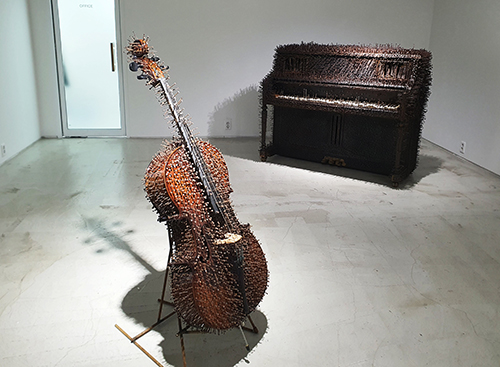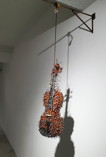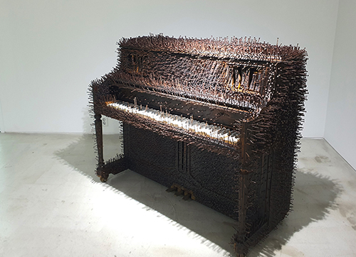 이때의 ‘못’은 단순한 재료가 아니라 신성한 행위의 상징이 된다. 나무 십자가에 못 박힌 예수의 육체처럼, 작가의 못질은 희생과 구원, 고통과 존재의 문제를 호출한다. 피아노나 첼로, 바이올린은 자연(나무)이 인간의 손에 의해 문명의 예술로 변형된 존재들이다. 그 위에 박힌 못은 문명이 자연을 관통한 흔적이자, 동시에 예술가가 다시 그 문명 위에 새긴 속죄의 표식이다.
