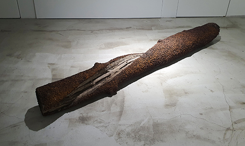 못을 박는 행위는 그의 작업에서 낯선 일이 아니다. 「나무」, 「심(心)」, 「죽은 나무를 위한 기념비」 등 전작에서도 그는 못을 주요한 조형 요소로 사용했다. 다만 그때의 못은 나무의 결을 따라 굽혀지고, 다시 박히는 일종의 ‘감싸는 행위’였다. 마치 상처를 봉합하듯, 혹은 천으로 감싸듯이, 작가는 죽은 나무의 굴곡을 존중하고 그 형상을 따라갔다. 그 못들은 파괴보다는 수용과 치유의 제스처였다. 그러나 이번 작업에서의 못은 더 이상 구부러지지 않는다. 악기의 표면을 관통한 못들은 곧고 단단하게 박히며, 마치 가시처럼 돋아난 상처의 흔적으로 남는다.
