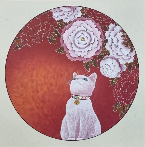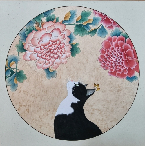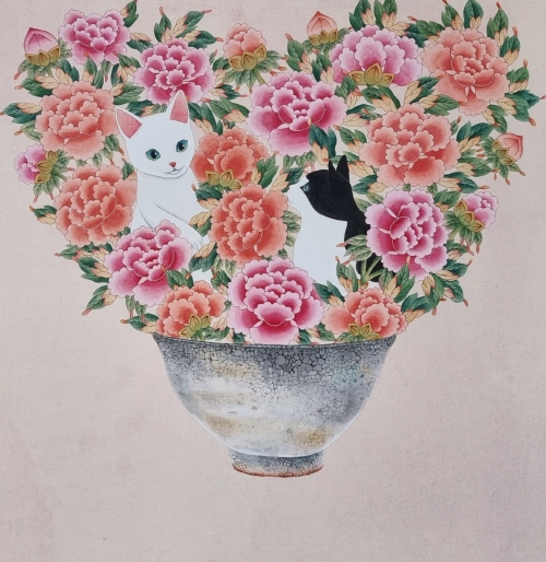 모란과 고양이_66x69cm_염색지에 분채-봉채