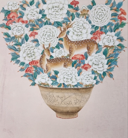 모란과 사슴_66x69cm_염색지에 분채-봉채