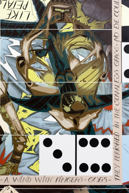 <카프리초스 #8>(2015)에서는 번개 모양의 절단선, 파편화된 인물, 작은 별빛이 뒤섞인 밤하늘, 도미노 패와 각진 가면 같은 얼굴, 뒤틀린 신체가 짙은 파랑, 노랑, 초록의 폭발적인 색조 속에서 부상한다. 특히, 미국 남북전쟁의 참상을 다룬 디킨슨의 시 <They Dropped Like Flakes>(1862)의 시 구절이 손글씨로 화면의 테두리를 따라 흐르며, 시적 울림과 묵시록적 긴장감을 더한다.