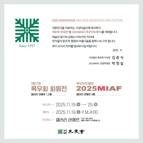 * 전시메일에 등록된 모든 이미지와 글은 작가와 필자에게 저작권이 있습니다. * vol.20251119-제87회 목우회 회원전 · 2025 MIAF |