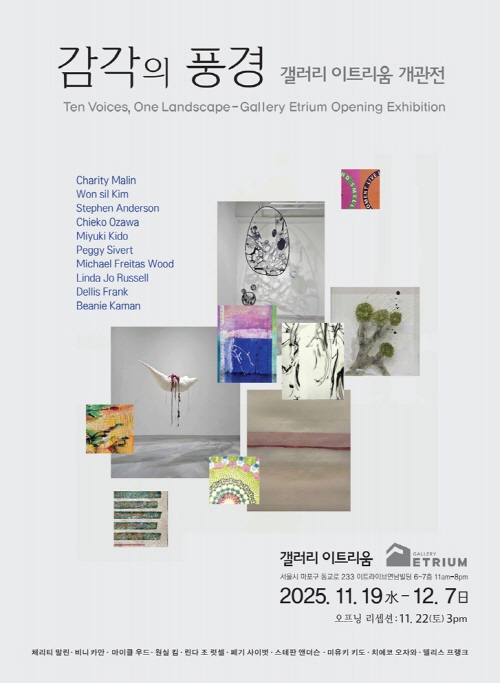 11월, 계절은 절정에 이르고 공기는 익어가며 시간은 조금 더 천천히 흐른다. 이 느린 흐름 속에서 우리는 서로의 감각을 건네고 사유의 조각을 맞대며 예술의 또 다른 풍경을 마주한다. ‘감각의 풍경‘은 갤러리 이트리움의 개관을 알리는 첫 전시이자 공간 · 사람 · 예술이 유기적으로 이어지는 새로운 감각의 실험이다. 이번 전시는 미국과 일본의 현대미술 작가들이 모여 각자의 내면에 자라난 생각의 결을 펼쳐 보이며, 그 차이와 공명을 통해 하나의 감각적 지형’ 그려낸다. 이 전시에서 작품은 벽에 걸린 이미지가 아니라 공간을 매개로 확장되는 경험의 언어가 된다. 조명과 소리, 그리고 여백까지 모든 요소가 예술의 일부로 작동하며 관람자는 그 풍경 안을 천천히 걸어 들어가듯 감각의 흐름을 따라간다. 작가들은 회화와 설치로 서로 다른 매체를 통해 자신만의 내면 풍경을 펼쳐낸다. 그들의 시선은 일상의 틈새에서 존재의 흔적을 발견하고, 기억의 층위 속에서 감정의 파편을 길어 올린다. 그곳에서 예술은 설명되지 않고, 오직 느껴지는 것으로 존재한다. 감각의 풍경은 완성된 이야기의 종착점이 아니라 각자의 감각이 교차하며 만들어내는 열린 공간이다. 여기서 예술은 관람자의 시선 속에서 다시 태어나고 사유는 감각으로 감각은 다시 또 다른 사유로 확장된다. 이 전시를 통해 묻는다. 예술은 어디에 머무는가. 작품 그 자체인가 아니면 작품을 설치한 공간인가, 혹은 그 사이의 우리 자신인가. 이 공간에서 우리는 자신만의 감각의 풍경을 발견할 수 있다. 그 순간 예술은 비로소 살아 있는 경험이 될 것이다.