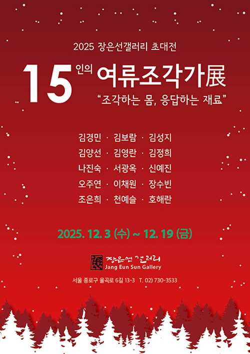 마음을 가다듬고 한 해의 끝을 매듭짓는 12월, 이번 15인의 여류조각가 전시는 한국 조각계에 여성 작가들의 존재와 목소리를 조명하는 동시에, 성별을 넘어 예술적 다양성과 심미적 깊이를 제시한다. 개별적이지만 서로 공명하는 각각의 15개 예술세계를 경험하는 전시가 될것이며 30여점의 작품이 장은선갤러리에서 선보인다. 15인의 여류조각 작가들은 왕성한 활동을 하며 독자적으로 구축한 멋진 예술세계를 넓게 펼쳐나가고 있다.