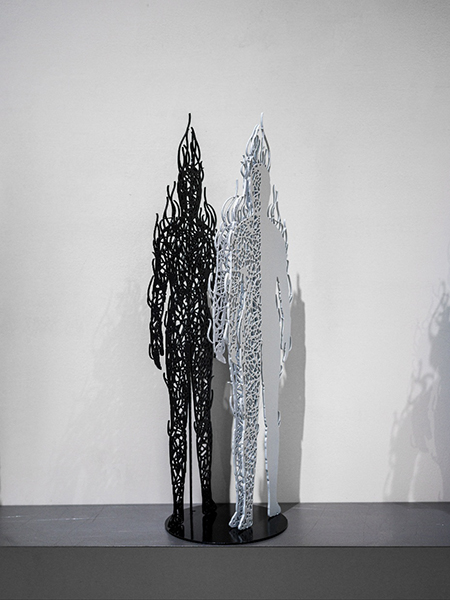 김보람 作_silent_400x300x600mm_fabric on PLA (좌) 서광옥 作_겹쳐지는시선들(Overlapping gazes)_60x60x40cm_Stainless steel, thread, glass (우)
