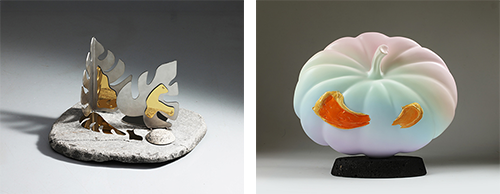 이채원 作_도시인이 자연을 보는 방법_47x36x32(h)cm_스테인리스 스틸, 황동, 화산석, 세라믹 폼 (좌) 장수빈 作_Pumpkin (Rainbow)_500x120x490(h)mm_레진, 혼합재료, 현무암 (우)