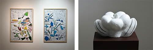 김양선 作_keep going_55x79cm(2pc)_wood. resin (좌) 호해란 作_꽃.집_19x11x20cm_ceramic (우)