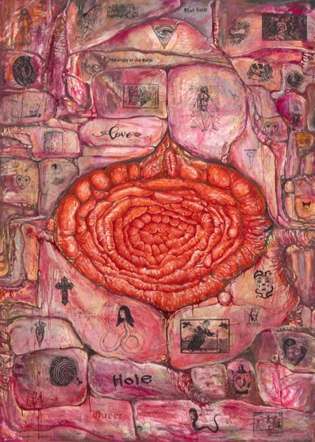 Gore Deco - The Origin of the World, 2025_Oil, oil pastel, silkscreen, transfer print on linen_227.3x162.1cm