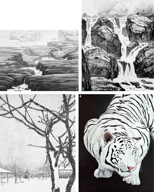 1 고갑석 作_미지의 땅_50F_장지수묵_2025 2 이정숙 作_계곡의 소리_30F_장지수묵_2022 3 맹완영 作_그리운 겨울날_50F_장지수묵_2024 4 송규이 作_白毫放光_50F_장지채색_2025