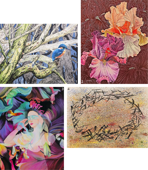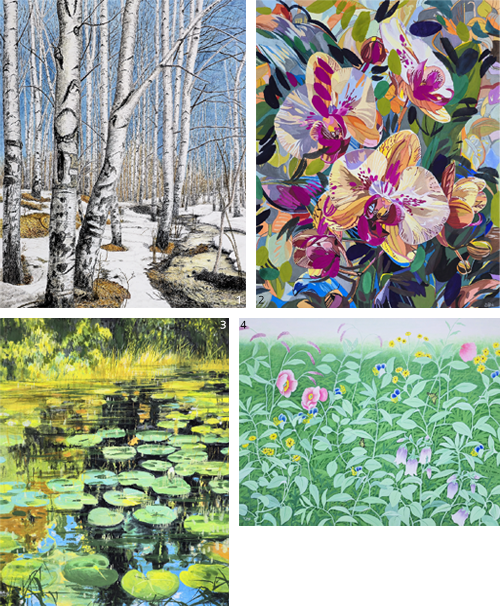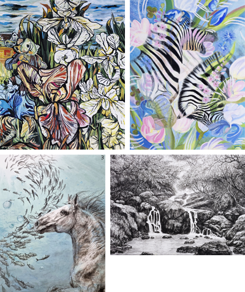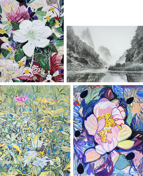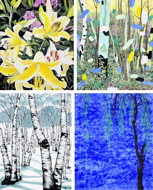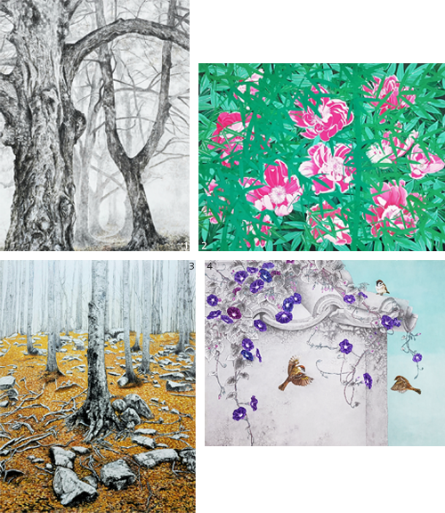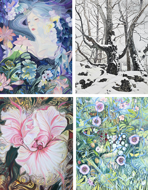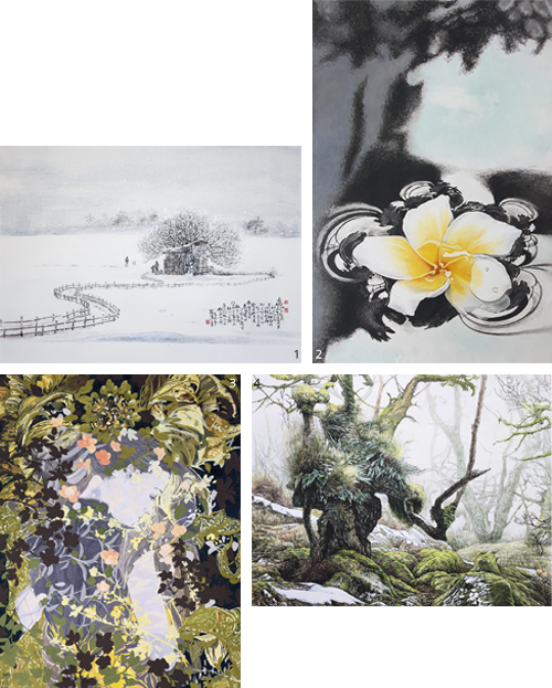 1 박명옥 作_겨울나무 숲_30F_장지채색_2025 2 노연호 作_화려한 유희_30F_장지채색_2025 3 김윤식 作_연못의 상생_30F_장지채색_2025 4 강진숙 作_낙원에서_30F_장지에 채색_2025