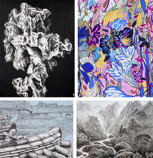 1 양동윤 作_비암(秘巖)3_50F_장지수묵_2024 2 박재현 作_선의 유희_50F_장지채색_2025 3 서정희 作_추억의 시간여행_50F_장지수묵_2025 4 연정미 作_심산유곡_30F_장지수묵_2025