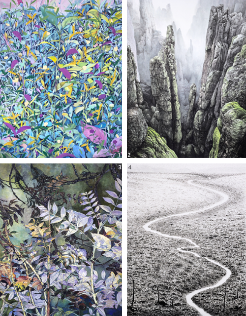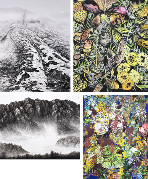 1 김선희 作_한겨울의 정취_50F_장지수묵_2025 2 오동진 作_채집일기_30F_장지수묵담채_2025 3 이종덕 作_소요유_30F_장지수묵_2024 4 박계원 作_사유의 숲_50F_장지채색_2025