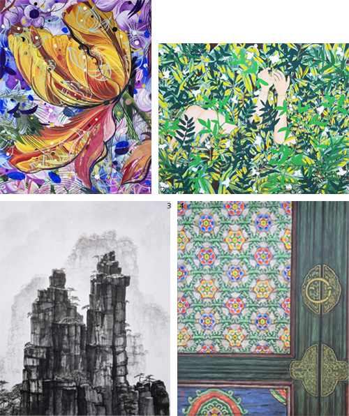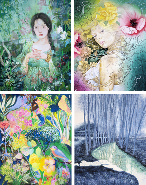 1 김은숙 作_꽃의 여인_50F_장지채색_2025 2 김민지 作_선율_50F_장지채색_2025 3 정희숙 作_낙원_30F_장지채색_2025 4 김윤영 作_감성적 풍경_30F_장지채색_2025