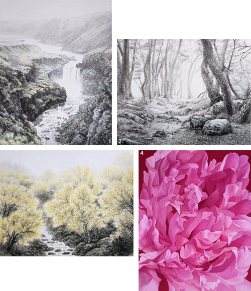 1 이차영 作_생의 찬가2_15F_장지채색_2025 2 이인금 作_감성의 숲_20F_장지채색_2025 3 이현구 作_겨울사색_40F_장지채색_2020 4 길미재 作_새털구름 사이로 온 봄_30F_장지채색_2025