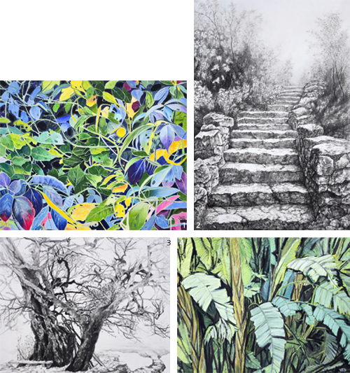 1 김병학 作_숲의 변주곡_30F_장지채색_2025 2 이기완 作_계단 너머의 봄_50F_장지수묵_2025 3 김순종 作_겨울나기_30F_장지수묵_2025 4 전윤정 作_파초의 꿈_30F_장지채색_2025