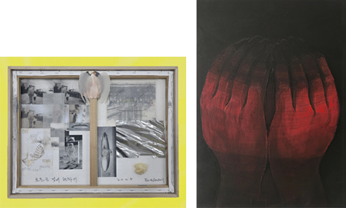 고봉수 作_흐르는 것에 관하여_53x65x5cm_mixed media_2025 (좌) 김성복 作_이별-RED_33x24cm_아크릴채색_2025 (우)