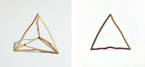 장준호 作_4개의 점을 위한 6개의 선(모형)_15x14x12.5cm_wood_2020 (좌) 장준호 作_가장 완벽한 삼각형을 위한 드로잉_28x28x4.5cm_pen, acrylic on panel_2020 (우)
