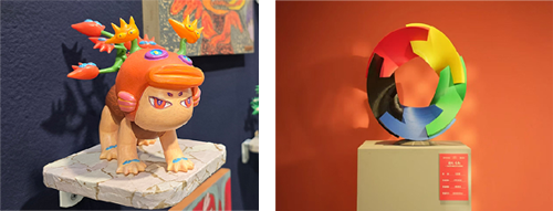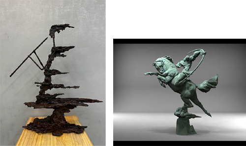 张华(장화) 作_바람의 노래_21x20x6cm_스테인리스강_2025 (좌) 穆森(무센) 作_踏云逐日(구름을 밟고 태양을 쫓다)_35x35x28cm_수지_2025 (우)