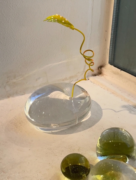 유리 조형작업의 유연한 형태감 그리고 가마 안에서 소성되는 예측을 뛰어 넘는 이미지들의 조합은 우리의 삶을 닮았습니다. 투명하게 모든 것을 투영하고 있다가도, 뜨거운 가마에서 나온 유리의 원 재료는 마음먹기에 따라 형태를 컨트롤 할 수 있죠. 유리판 위에 마른 식물들의 흔적과 여러 오브제들은 뜨거운 불 속에서 자연스러운 깨짐과 상상을 넘어선 상처 같은 형상으로 남습니다. 예측을 넘어선 상상이 있기에 다음 발걸음이 흥미 있고, 호기심 어린 눈망울로 내일을 기다릴 수 있는 인생을 닮았습니다. 유연함이 존재하는 이번 전시, 《Liquid Green》에서 작가가 건네는 “그래도, 괜찮아”를 여러분과 함께 하고자 합니다.