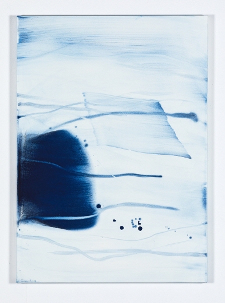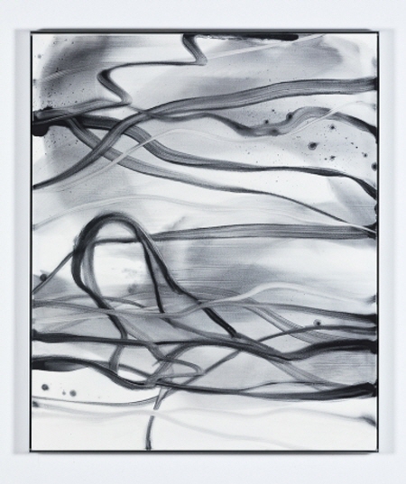 이번 전시의 중심을 이루는 신작 < Overlap (중첩) > 연작은 작가가 30여 년 전 수행했던 작업 방식과 긴밀하게 맞닿아 있다. 당시 작가는 석판 위에 안료를 붓고 알코올이나 용제를 더해, 순간적으로 발생하는 화학적 반응 속에서 즉각적으로 도상을 그려냈다. 이러한 과정에서 체득된 신체적 감각은 여전히 그의 작업에 내재해 있으며 초기의 매체 실험은 시간을 가로질러 오늘날의 신작으로 자연스럽게 이어진다. 액체 상태의 아크릴 물감과 달리, 분말 형태의 안료는 전혀 다른 물성과 반응을 캔버스에 남긴다. 종이의 색감을 연상시키기 위해 채색된 캔버스 바탕 위에는 먹의 농담을 떠올리게 하는 선들의 미묘한 농도 차와, 얇지만 깊이 있는 ‘결’의 표현이 두드러진다. 분말 안료 특유의 빠른 건조 속도와 번짐의 성질은 즉흥적인 행위와 오랜 시간 축적된 기술이 공존하는 화면을 만들어낸다. 작가는 선을 보다 자유롭게 풀어내기 위해 캔버스를 세운 상태에서 안료를 붓고 흘려보내는 행위를 반복한다. 이 과정에서 선은 일방적인 통제의 대상이 되기보다, 중력과 물성에 반응하며 스스로 생성된다. 그 결과 화면 위에는 의도와 우연이 겹쳐진 흔적들이 시간의 층위처럼 축적된다. 작가는 자신의 개입을 최소화한 채 재료와 과정이 작동하도록 함으로써, 작품을 하나의 열린 장으로 남겨둔다. 그 안에서 30여 년 전의 작업 방식은 현재와 병치되고, 시간의 흔적은 화면 위에 축적되어 ‘중첩(overlap)’의 상태에 이른다.