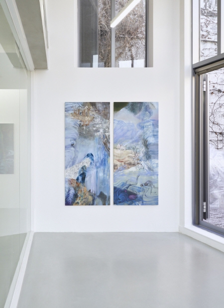 작가의 출산 경험은 이러한 세계를 한층 더 확장했다. 출산은 그에게 신체의 경계를 재정의하는 사건이었고, 몸이 존재를 담는 그릇이 아니라 흐르는 상태라는 사실을 강렬하게 자각하게 했다. 비슷한 시기에 접한 조선의 무가, 특히 출산무가에 반복적으로 등장하는 문, 숨, 빛은 작가에게 깊은 인상을 남겼고, 회화 안에 자연스럽게 영향을 주었다. 작가가 쓴 문장, “문이 열리고 새 숨이 이 세상으로 지나오니, 피의 문을 지나 첫 울음이 길을 찾는다”는 작업 전체를 관통하는 열림과 순환, 생성의 감각을 예감하게 한다. 출산 이후 박은정의 회화는 신체가 더욱 조각나고 원소적으로 변하며, 육체적 경험의 순간들이 색과 리듬의 흐름 속에서 새로운 감각적 형식(<Echo in the Mist(안개의 메아리)>, 2025, <Conversation in Water(물속의 대화)>, 2025)으로 자리 잡는다.