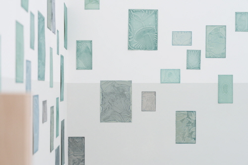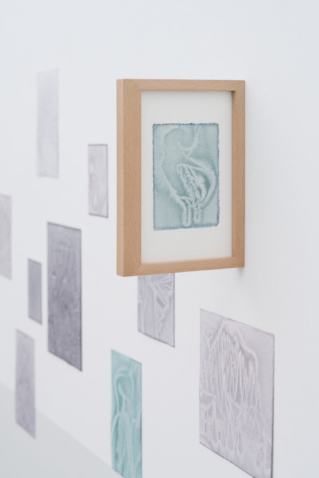 꿈이 파도의 거품이라면 수면 아래 침잠해 있는 것은 무엇일까? 국동완은 내연의 잔물결을 더듬으며 아득하게 해묵은 미결의 대상들을 마주해 보기로 한다. 이내 그는 꿈을 물의 물성으로 여기고, 종이라는 그물을 이용해 심연의 강 아래 서식한 이들을 하나둘씩 퍼 올리기 시작했다. 맑은 물에 잉크를 풀어 조색한 다음 날카로운 송곳으로 이미지를 새긴 용지를 담가 염색하는 식이다. 할퀸 자국에 안료가 스미고, 꺼내어 건조하는 동안 종이는 송곳에 긁힌 표피 위로 머금은 잉크를 내뱉는다. 핏방울처럼 봉긋하게 솟아오른 액체가 마른 자리의 이면에 머지않아 크고 작은 멍울이 진다. 이를 조용히 기다리거나 손수 닦아내는 일련의 과정은 그 자체로 상처와 치유의 반복이다. 작가는 잉크가 번지는 모양을 관찰하며 유난히 지워지지 않아 끈질기게 딸려 오는 얼굴과 장면들을 묵상한다. <에피스트로피3> 연작은 그러한 태도를 반증하듯이 어딘가 비슷한 도상들을 반복해서 제시하는데, 동시에 제가끔 다른 무늬와 얼룩을 지닌 이들은 엇갈리는 파동으로 공간을 잠식한다. 이는 반복해서 꾸는 꿈일지언정 결코 동일할 수 없음을 암시한다. 그렇게 수면 너머로부터 건져 낸 탁본에는 나, 언니, 동생, 엄마, 태아, 하얀 비둘기, 숲, 나무 덩굴, 호박, 버섯, 초롱꽃, 달, 집, 마을, 사원, 책, 구슬, 양초, 낙서 등이 등장해 가상의 풍경을 이룬다.