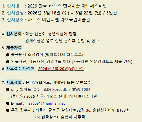 * 전시메일에 등록된 모든 이미지와 글은 작가와 필자에게 저작권이 있습니다. * vol.20260220-2026 한국 라오스 현대미술 아트페스티벌 |