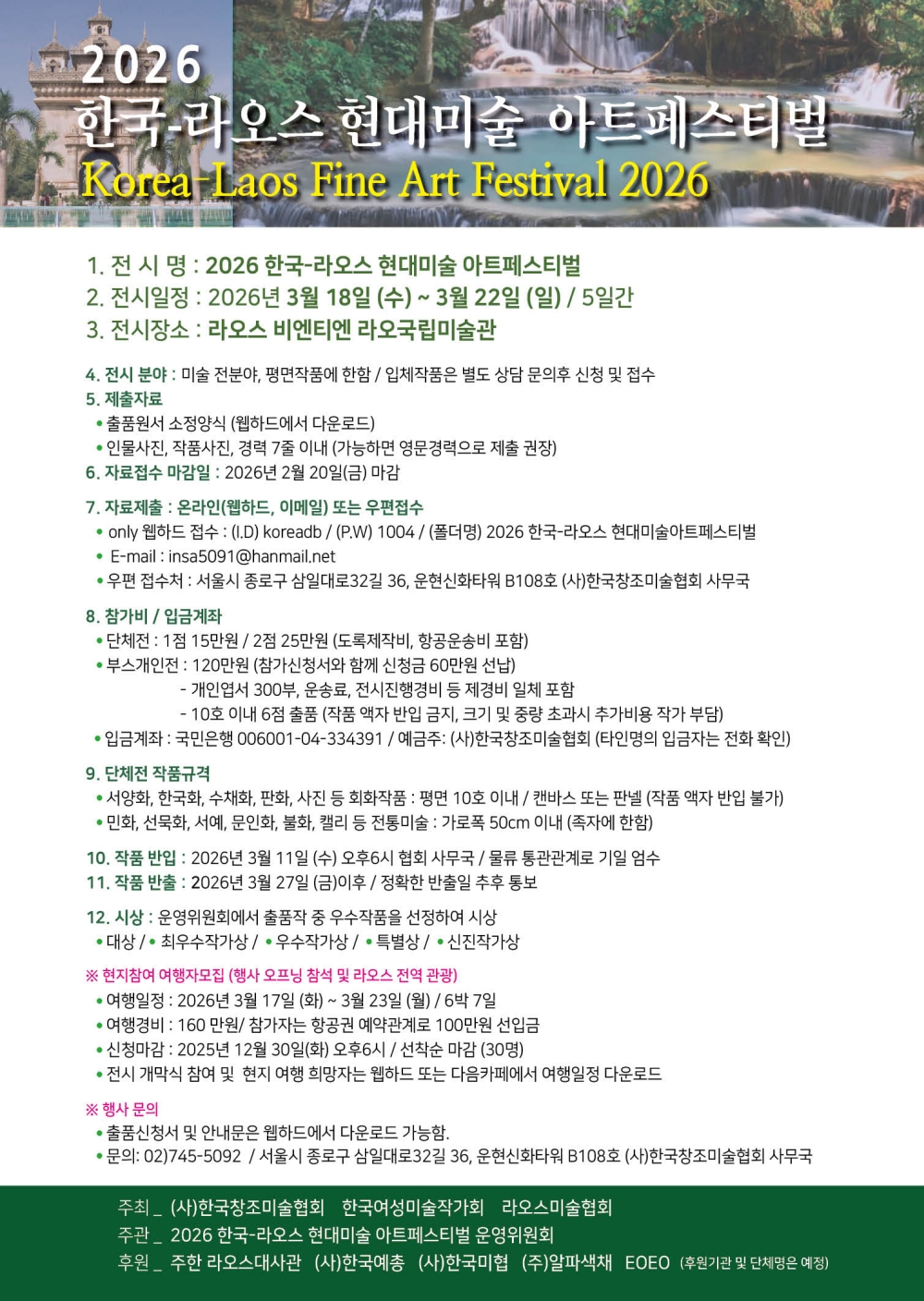 주최 _ (사)한국창조미술협회 | 한국여성미술작가회 | 라오스미술협회 주관 _ 2026 한국-라오스 현대미술 아트페스티벌 운영위원회 후원 _ 주한 라오스대사관 | (사)한국예총 | (사)한국미협 | (주)알파색채 | EOEO (후원기관 및 단체명은 예정)
