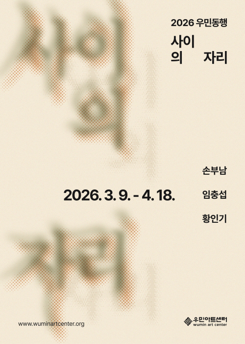 2026 우민동행《사이의 자리》는 자연과 문명, 동양과 서양, 인간과 비인간 등으로 나뉘어 온 이분법적 구분을 넘어, 구획되기 이전 혹은 규정될 수 없는 중간 지대에 주목합니다. 이 ‘사이의 자리’는 공존과 분리가 교차하며 화합과 긴장이 함께 유지되는 중첩의 공간입니다. 이러한 중간 지대의 풍경을 각자의 방식과 조형언어로 그려온 손부남, 임충섭, 황인기 작가의 작업을 통해 그 사이에 머무는 감각과 사유를 함께 나누고자 합니다.