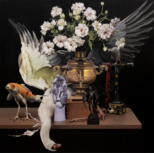 이정웅 作_새발의 물고기와 고니 그리고 사모바르 A Bird-legged Koi, Swan, and Samovar, 2026_ oil on canvas_100x100cm
