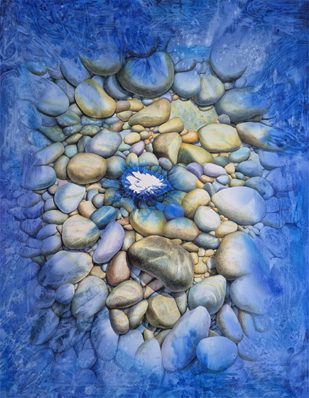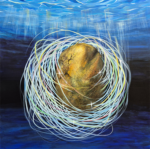 작품에 등장하는 돌의 균열과 불규칙한 표면, 그리고 미묘하게 변화하는 색조는 개인의 내면에 축적된 시간과 흔적을 암시한다. 단단해 보이는 돌이 지닌 미세한 변화들은 고정된 정체성이 아니라, 경험에 따라 끊임없이 변형되고 재구성되는 자아의 모습을 은유한다. 빛에 따라 달라지는 색과 분위기는 감정과 기억이 떠오르고 사라지는 순간을 포착하며, 자아가 하나의 상태로 머무르지 않고 유동적으로 존재함을 드러낸다. 돌과 함께 배치된 나비, 꽃, 잉어, 잠자리, 빛기둥 등의 요소들은 서사를 단정 짓기보다는 열린 해석의 구조를 형성한다. 이러한 상징적 장치들은 관람자가 각자의 기억과 감정, 개인적인 이야기를 자유롭게 투영하도록 유도하며, 작품을 감상하는 과정 자체가 사유와 성찰의 경험이 되도록 한다. 결과적으로 「몽돌」 연작은 섬세한 리얼리즘과 초현실적 공간, 상징적 요소들이 결합된 회화로서, 자아를 고정된 실체가 아닌 변화하고 축적되는 과정으로 제시한다. 관람자는 작품 속 돌을 통해 자신의 내면을 비추어 보고, 감정과 기억의 층위를 재해석하며, 조용한 치유와 성찰의 시간을 경험하게 된다.