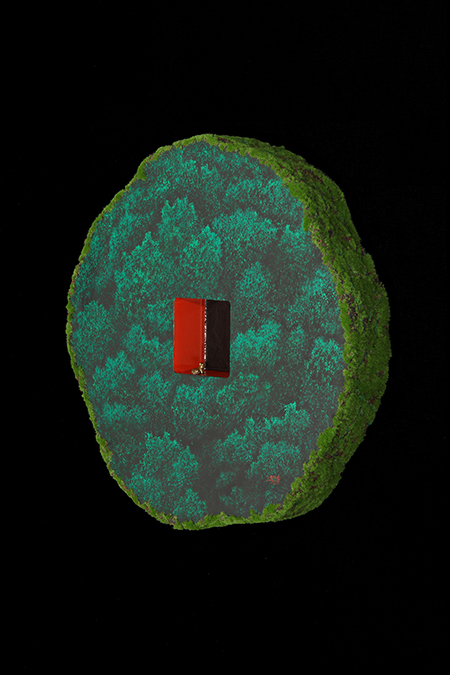 수묵과 채색의 혼용, 전통 한지를 넘어 화판을 오리고 뚫는 행위는 숲을 해체하려는 시도가 아니다. 그것은 숲이 성립되는 조건, 즉 관계와 마찰, 비어 있음과 저항의 구조를 드러내기 위한 몸의 개입이다. 레진, 은박, 금박, 돌과 같은 재료들, 그리고 원과 사각형의 기하 형태는 장식이 아니라, 바람과 흐름 속에서 필연적으로 생성되었다가 이내 사라지는 물질적 상징체계를 교란하기 위한 장치이다.