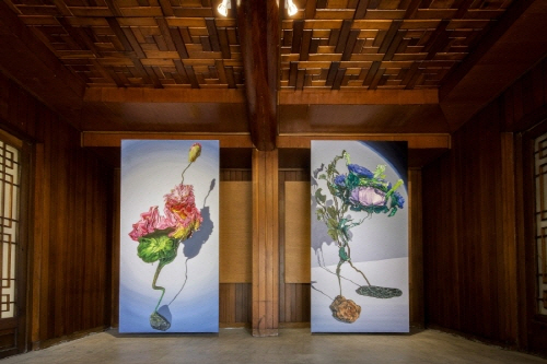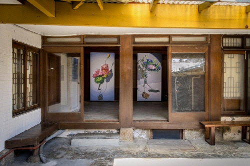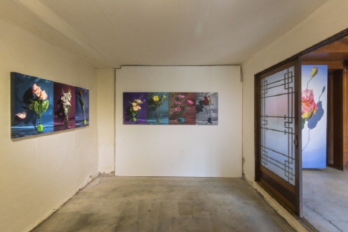 그 첫 번째 전시 《화전가》는 조선 후기 여성들의 공동 창작 형식인 규방가사 <화전가>를 출발점으로, 박슬기 작가가 그리는 “꽃”을 통해 디지털 이미지와 회화, 그리고 기록의 방식이 어떻게 교차하는지를 탐색한다. <화전가>는 여성들이 봄날 산이나 들에서 화전놀이를 즐기며 가사를 짓고 낭송하는 과정에서 형성된 규방가사로, 현장 창작, 윤작과 낭송, 사후 기록이 교차하는 참여적이고 유동적인 형식을 지닌다. 이 전시는 그 구조를 단순한 전통이 아닌 하나의 기록 기술이자 매체적 실천으로 재해석한다.