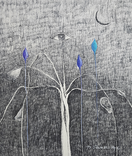 박신혜의 ‘볼링(1997)’ 에서 투명한 공 안에 갇힌 뇌는 인간의 이성과 지각의 중추를 상징하며 지각의 주체(뇌)를 객체(공)안에 가둠으로 생각하는 나와 보여지는 나 사이의 분열을 시각화 했다. 볼링은 쓰러뜨려야 하는 대상(핀)과 던지는 주체(공/뇌)가 명확한 게임입니다. 하지만 이 그림에서 뇌는 공안에 갖혀있고 핀들은 이미 쓰러져 있거나 위태롭게 서 있습니다. 퐁티의 관점에서 보이는 자가 곧 보는 자가 되는 전도를 보여주고 있습니다. 화면 전체를 지배하는 집요한 목탄의 획은회색의 우울을 드러내며 퐁티의 개념으로 지각, 몸, 기억, 타인과의 관계, 문화 등이 얽힌 세계의 두께를 느끼게 합니다. 이 작품은 90년대 후반 귀국함으로 다시 만나게 된 부조리한 한국사회에서의 갈등을 잘 보여 줍니다 작가가 한국사회를 인식하는 방식이 얼마나 복합적이고 고통스런 지각의 무게였던가를 보여주는 작품입니다. 또한 퐁티는 몸을 세계와 소통하는 지각의 주체로 보았으며 예술은 가시적인 것 너머 비가시적인 본질을 드러내는 과정이라 설명했듯이 앞면의 박신혜작 ‘눈(1997)’에서 나무의 형상 위에 돋아난 감각기관들은 자연(세계)와 유기적으로 연결되어 있음을 시사합니다. 나무는 생명을, 감각기관은 인식의 통로를 의미하며, 중앙 상단의 눈은 인간은 곧 세계를 지각하는 존재라는 철학적 명제를 함축해 보여줍니다. 박신혜의 1997년의 작업들에서 이 후 천작하게 되는 ‘바다의 신체화’와 ‘존재’에 대한 감각적 탐색의 시작점을 여기서 찾을 볼 수 있다.