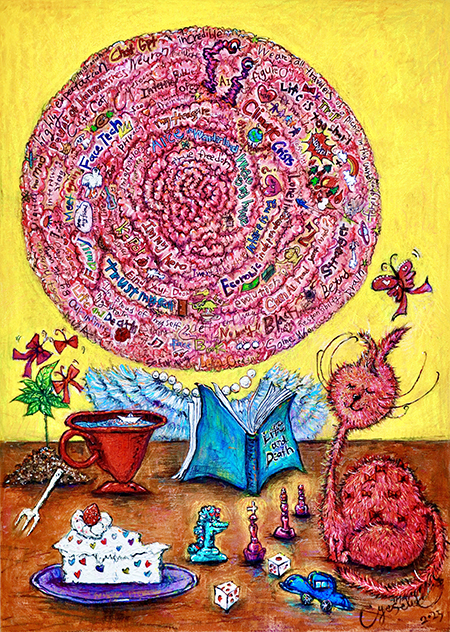 작품의 장면들은 밝고 강렬한 색채와 큐빅과 같이 반짝이는 장식적 요소로 구성되면서도 그 안에는 삶과 죽음, 불안, 존재에 대한 질문이 함께 놓여 있다. 특히 ‘치킨 시리즈’는 소비 사회의 아이콘을 인류세적 상징으로 전환한 작업으로 학계에서 제안된 “미래의 화석은 치킨 뼈일 것이다” 라는 관점을 반영하며 치킨은 단순한 소비재를 넘어 삶과 죽음이 공존하는 아이콘으로 재해석된다. 식탁 위 유희와 몰락, 전쟁과 도피의 장면은 연극처럼 구성되며 다음의 질문을 던진다: