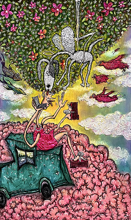 천예슬 작가의 작품은 인간이 이 세계의 주인이 아니라 잠시 머무르는 여행자이자 세입자라는 철학적 사유에서 출발한다. 화면에는 사람뿐 아니라 다양한 동물과 곤충 같은 존재들이 위계 없이 등장하며, 모두가 같은 세계를 공유하는 유기적 관계를 드러낸다. 드로잉에서 시작된 선과 덩어리는 재배치되어 콜라주와 얕은 입체 구조를 이루며, 작은 무대처럼 구성되어 표현되며, 연극처럼 연출된 장면들은 생태적 위기와 존재론적 질문을 확장하게 한다. 작가는 강렬한 색채와 반짝이는 장식 요소 속에 삶과 죽음, 불안과 존재의 의미를 재해석한다.