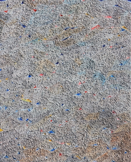 신용덕_미술학박사 작가는 자신의 미학적 관점, 과거 경험, 특별한 관심, 좋아하는 것을 작품의 모티프로 작업하는 경향이 많다. 그런 것들은 작가의 성향이나 정체성을 나타내는 데 충분한 요건이 될 것이다. 지금까지 제작한 작품들을 보면 그 모티프들이 신용덕 작가의 정체성과 고유한 시간 속에서 경험한 것과 무관하지 않다. 근래 작업한 [선(線)과 결]연작은 유년시절에 한옥집(우리 집)을 짓는 과정을 지켜보았던 작가의 감정과 고유한 시간이 작품으로 표출된 것이다. 우리 동네에 기와집이 없던 시절, 우리 가족이 우리 동네에서 제일 먼저 아주 멋진 기와집을 지었던 것이다. 아주 자랑스러웠던 기억이 있다. 기와집에 대한 작가의 사랑은 그때부터 시작된 것 같다. 기와에서 느끼는 묵직한 무게감과 기왓장들이 이어진 기와 선(線)의 어울림이 만들어 내는 묘한 매력이랄까? 그 아름다움에 빠져들어 궁궐이나 한옥이 있는 지역을 자주 탐방하곤 한다. 작품 화면에는 주로 지붕을 위에서 바라본 모습이 나타나 있는데 지붕 위의 기와들이 모여 하나의 부드러운 흐름을 이루고 있다. 흐름을 뜻하는 우리말에는 ‘결’이라는 단어가 있다. 흔히 ‘물결, 머릿결, 나뭇결’이나 ‘한결같다’와 같이 ‘결’이라는 단어를 사용하는 데 여기서 ‘결’은 같은 방향을 향하여 멈추지 않고 지속하면서 생기는 세월을 기록해 놓은 무늬이고 문양이다. 이것은 과거로부터 미래를 연결하는 시간과 기억의 고리들이다. 벽에 회반죽을 두툼하게 바르거나, 황토를 짓이기고 거기에 볏짚을 썰어 넣어 황토 흙벽돌을 만드는 모습, 서까래를 올리는 모습 등, 그 기억의 고리들이 신용덕 작품 화면에 고스란히 물감층으로 나타나 있다. 두툼한 물감층은 기와의 무게감과 시간의 궤적을 나타내는 듯하다. 그것은 만지고 싶을 만큼 촉각적이고 견고함을 나타낸다. 작품 화면에서 선들이 모여 결을 이루고, 결들은 다양한 방향으로 얽히고설켜 있다. 색채는 다양하게 집약되어 있으며, 묵직한 황토칠과 회칠을 연상하는 재질감은 붓질의 거친 질감으로 표현되어 있다.