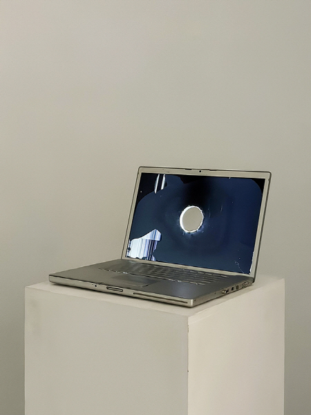 권현진은 디지털 매체와 물리적 행위 사이의 모순적 관계를 탐구한다. 이번 전시에서 선보이는 작업들은 '재생'과 '절단'이라는 상반된 개념을 교차시킨다. 《무제》는 가위로 물을 자르는 행위를 반복하는 영상 작업이다. 가위는 움직이고, 자르는 행위도 계속 수행된다. 그러나 물은 결코 잘리지 않는다. 가위는 여전히 가위의 행위를 하고 있지만, 물이라는 대상을 만나는 순간 '자른다'는 기능의 의미 자체가 흔들린다. 행위는 존재하되 목적에 닿지 못한 채 그 사이 어딘가를 맴도는 것이다. 《Monitor Work 2024-2》는 디지털 화면이 생성하는 빛의 물성에 주목한다. 작가는 모니터를 단순한 시각적 매개체로 바라보는 관점에서 나아가, 내부의 패널과 케이블 등 구성 요소를 해체하고 재조립함으로써 이를 하나의 독립된 오브제이자 캔버스로 전환한다. 비디오 재생 과정에서 발생하는 플리커(flicker)와 같은 매체 특유의 현상을 의도적으로 노출하며, 기기적 기능과 한계를 넘어서는 새로운 예술적 가능성을 실험한다. 정보를 송출하던 화면이 물리적으로 변형되어 하드웨어의 실재가 전면에 드러나는 순간, 관객은 가상 이미지와 이를 지탱하는 물질적 기반 사이의 긴장을 마주하게 된다.