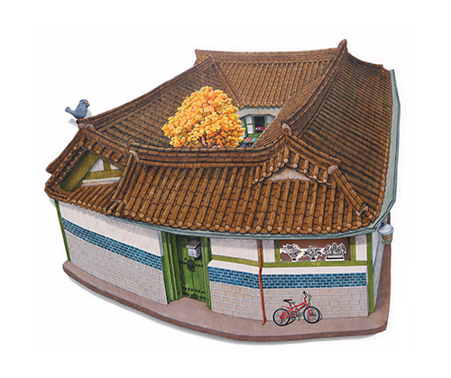 기와집의 숨결-봄 88X71X4cm_자작나무 합판 위에 아크릴, 목판화 컷팅,데님천_2026