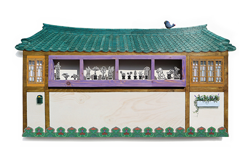 집이건네는말-화분사세요 124x68x5.5cm_자작나무 합판 위에 아크릴, 목판화 컷팅, 나무, 데님천_2024