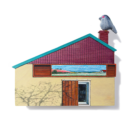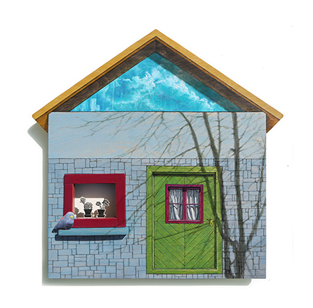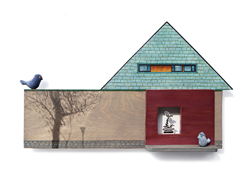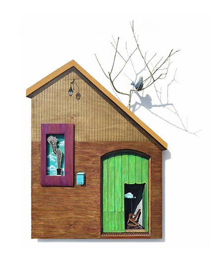 집이 건네는 말-소식 한 조각 88x98x23cm_자작나무 합판 위에 아크릴, 유화, 목판화 컷팅, 나무, 데님천_2025
