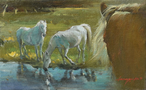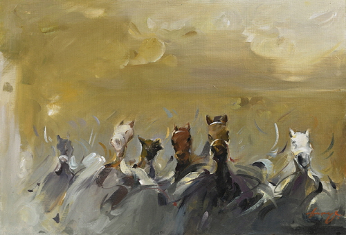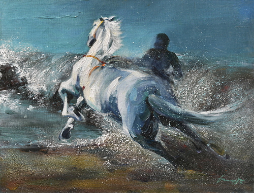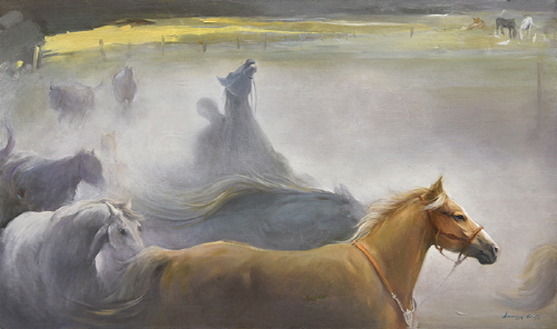 작가에게 말의 힘찬 네 발은 곧 '도전'이다. <군무(2002)>와 <도전(2008)>에서 분출되는 폭발적인 에너지는 문명을 전진시켰던 말의 기동성을 넘어선, 생의 근원적인 의지이다. 부서지는 파도를 뚫고 나가는 백마의 모습은 작가가 마주한 예술적 고뇌를 돌파하려는 자극이자 에너지가 되어 캔버스 위에 거친 유화의 궤적으로 남았다.