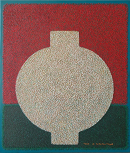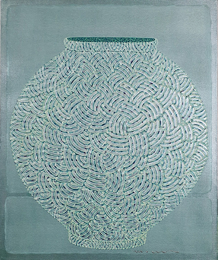 이정애 작가의 항아리는 수없이 반복된 작은 흔적들로 표면이 채워져 있다. 점처럼, 혹은 짧은 선처럼 이어지는 이 단위들은 끊임없이 겹쳐지며 하나의 밀도를 형성한다. 각각은 미세하게 다르고, 그 차이는 의도된 변형이기보다 지속된 시간 속에서 자연스럽게 발생한 흔들림에 가깝다. 이 반복은 장식이 아니라 행위이며, 수행이다. 같은 움직임을 끝없이 이어가는 과정 속에서 화면은 점차 응집되고, 그 응집은 하나의 상태로 굳어진다.