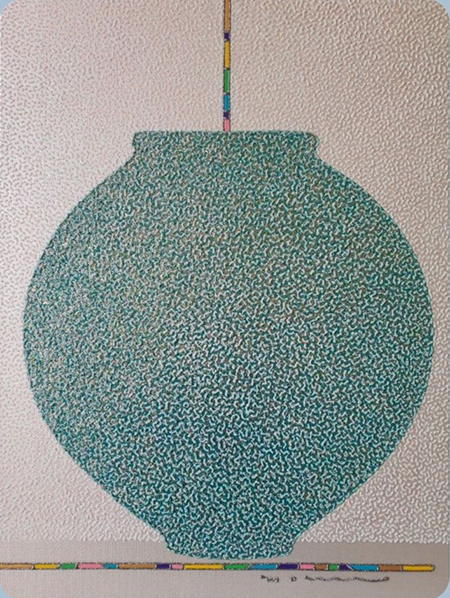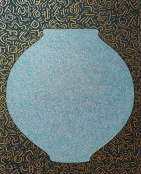 형태와 표면 사이에는 미묘한 긴장이 존재한다. 항아리의 윤곽은 흔들림 없이 고요하게 서 있지만, 그 내부를 채우는 선들은 끊임없이 움직인다. 정지와 운동이 동시에 유지되는 이 상태는 화면에 생동감을 부여하면서도, 쉽게 해소되지 않는 긴장감을 남긴다. 이 긴장은 단순한 시각적 효과라기보다, 삶의 시간 속에서 경험되는 감정의 구조에 가깝다. 반복되는 행위는 단순한 집중의 결과를 넘어서 정서를 확장한다. 멀리서 희미하게 반짝이는 빛을 바라보듯, 도달하기 어렵지만 계속 시선이 가는, 어떤 열망.