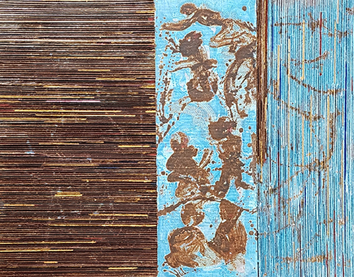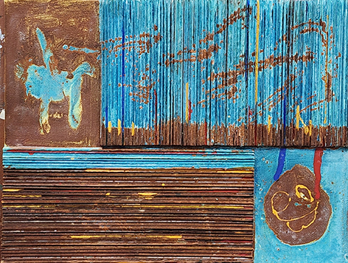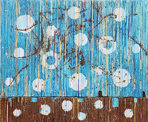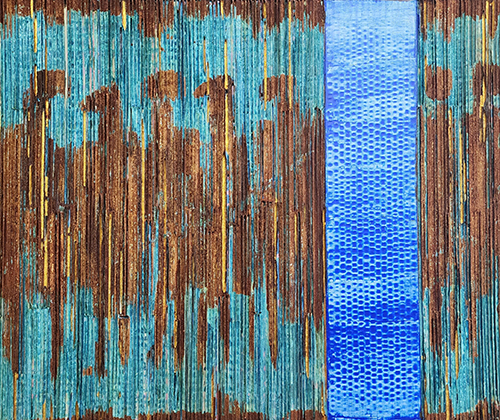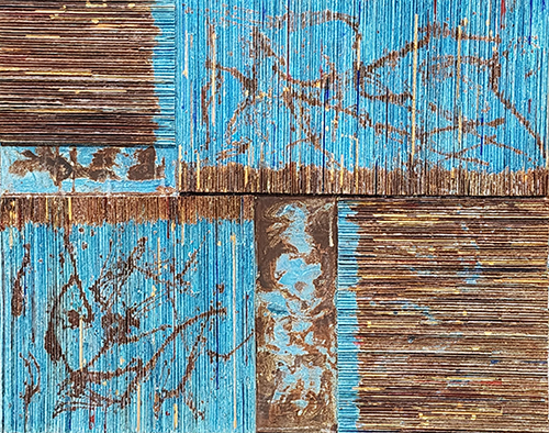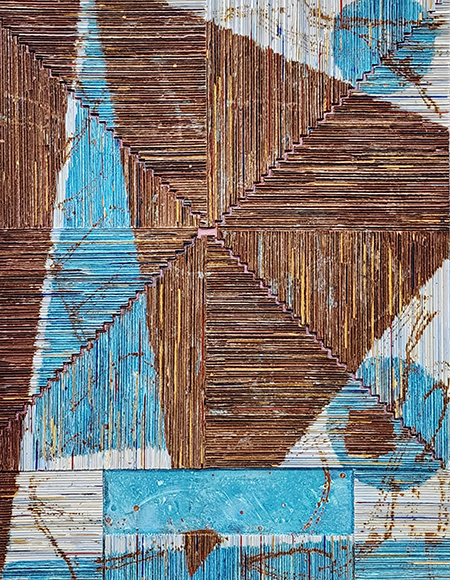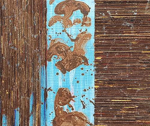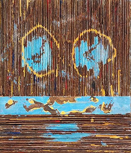 골판지의 규칙적인 요철은 마치 우리 삶이 견뎌온 촘촘한 시간의 결 같기도 하고, 우리가 매일 묵묵히 걸어가는 길의 흔적 같기도 합니다. 그 위에 금속 가루를 뿌리고 산화시키며 기다림의 시간을 더하는 것은, 인위적인 연출이 아니라 물질 스스로가 자신의 숨겨진 얼굴을 드러내길 기다리는 과정입니다. 화면을 가득 채운 수직의 선들은 나를 지탱해 주는 단단한 일상의 질서입니다. 하지만 그 곧은 선들 사이로 때로는 우연한 얼룩이 번지고, 때로는 알 수 없는 형상들이 고개를 듭니다. 그것은 계획된 지도가 아니라, 내 안의 깊은 무의식이 물질의 틈을 비집고 나와 그려내는 '마음의 지형도'입니다.