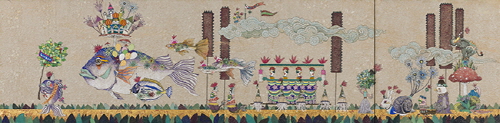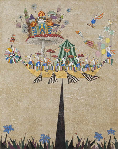 꽃길따라 두둥실_176.5x44cm_화판에 마대천, 황토, 석채, 24K금박_2020